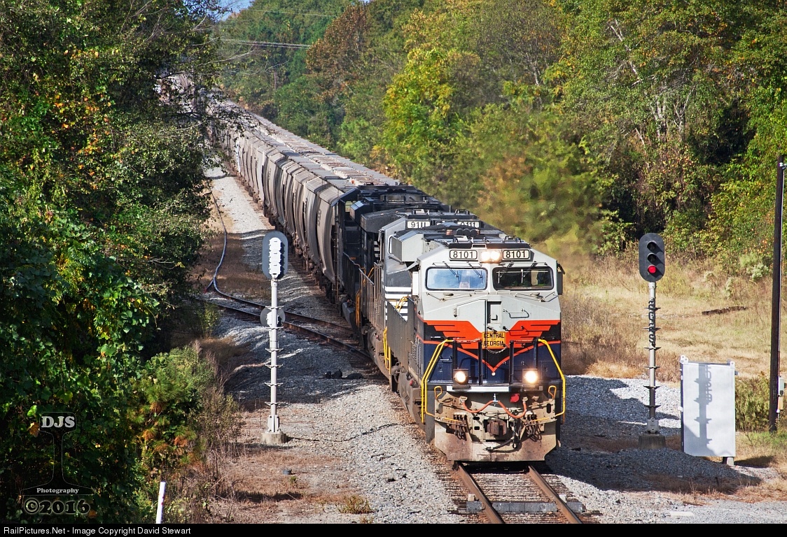 Although the signals at Walden east of Byron, Georgia say Southern Railway, the NS Albany District is former Central of Georgia trackage. The Central's adoring and classic blue & gray scheme grasp the lines of NS ES44AC 8101 and seems right at home leading empty grain train 55E as it passes over the HBD-DED at Walden while nearing Rutland Junction a few miles ahead prior to entering Brosnan Yard in Macon. October 19, 2016