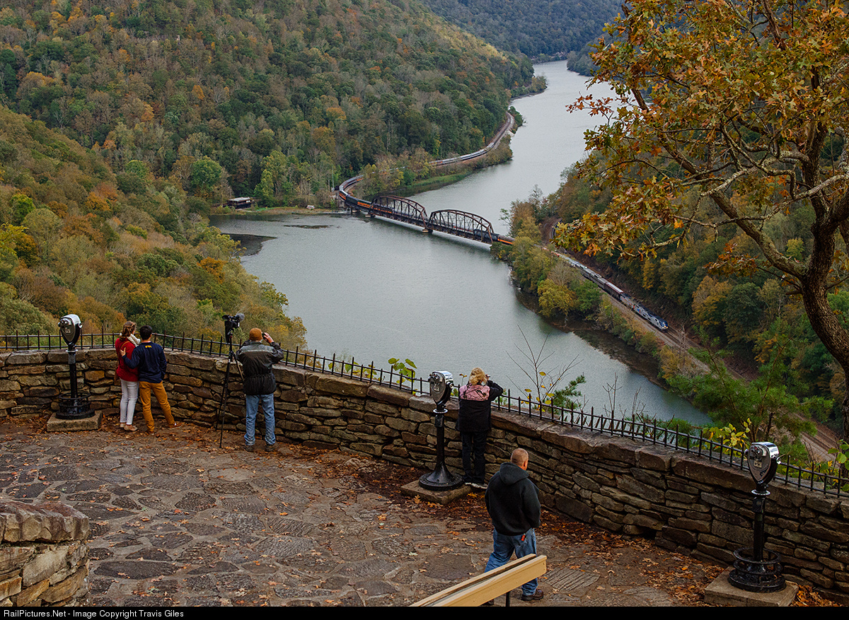 The New River Train passes through the gorge as onlookers from one of the overlooks watch it pass by.