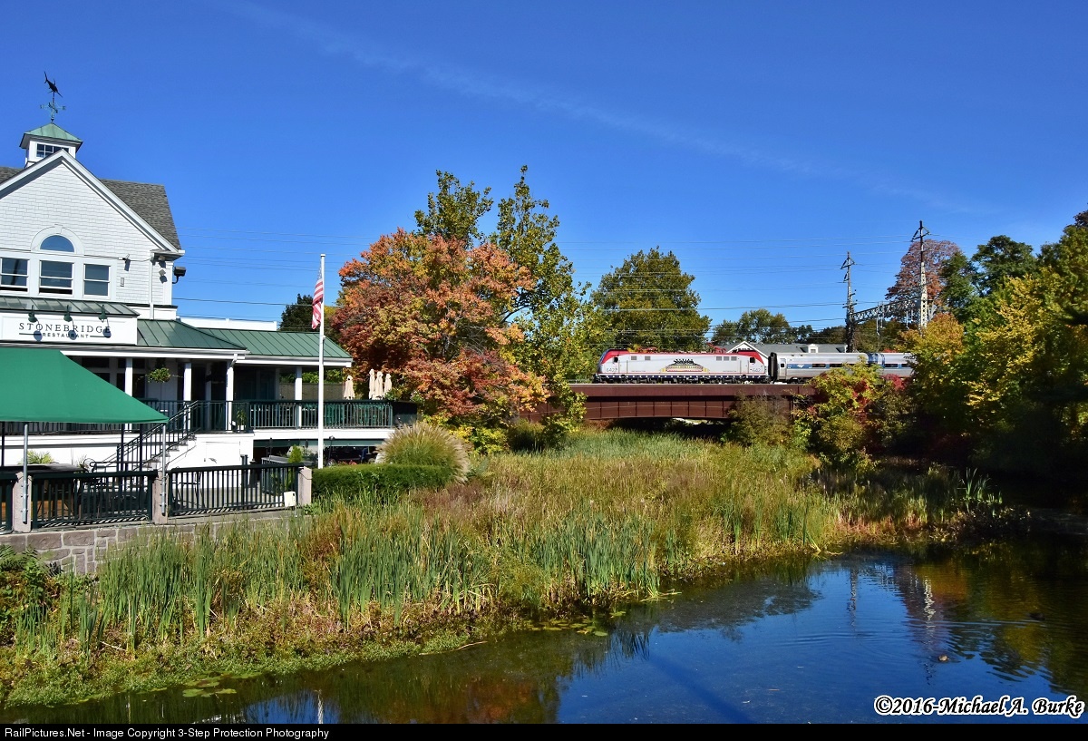 Amtrak's heritage ACS-64 642 "America's Railroad Salutes Our Veterans" leads Northeast Regional 99 over the Wepawaug River in Milford. The popular Stonebridge Restaurant is seen on the left.