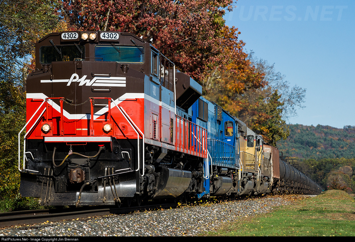 The last of the fall foliage clings to life as a loaded ethanol train works the hill into Brattleboro, VT. The ex-Florida East Coast leader, recently dressed in P&W colors, is in the capable hands of a New England Central crew on former Central Vermont trackage.