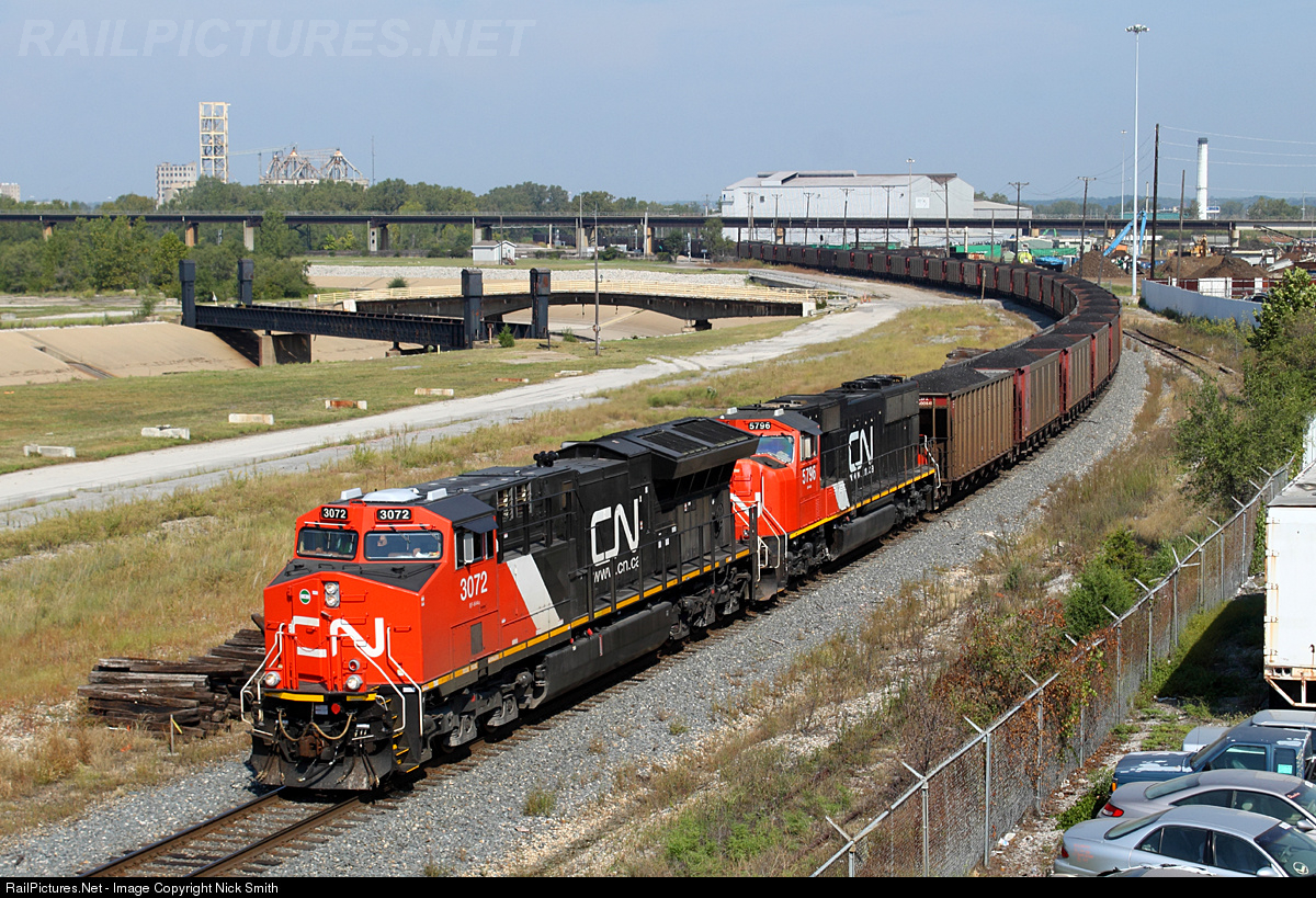 | A 2x2 consist of CN power lead a coal train that was sold to the Empire Plant near Pittsburg, Kansas. The train came off the CN at East St Louis and took the Gateway west across Missouri before turning running south out of KC on the KCS Pittsburg Sub. |