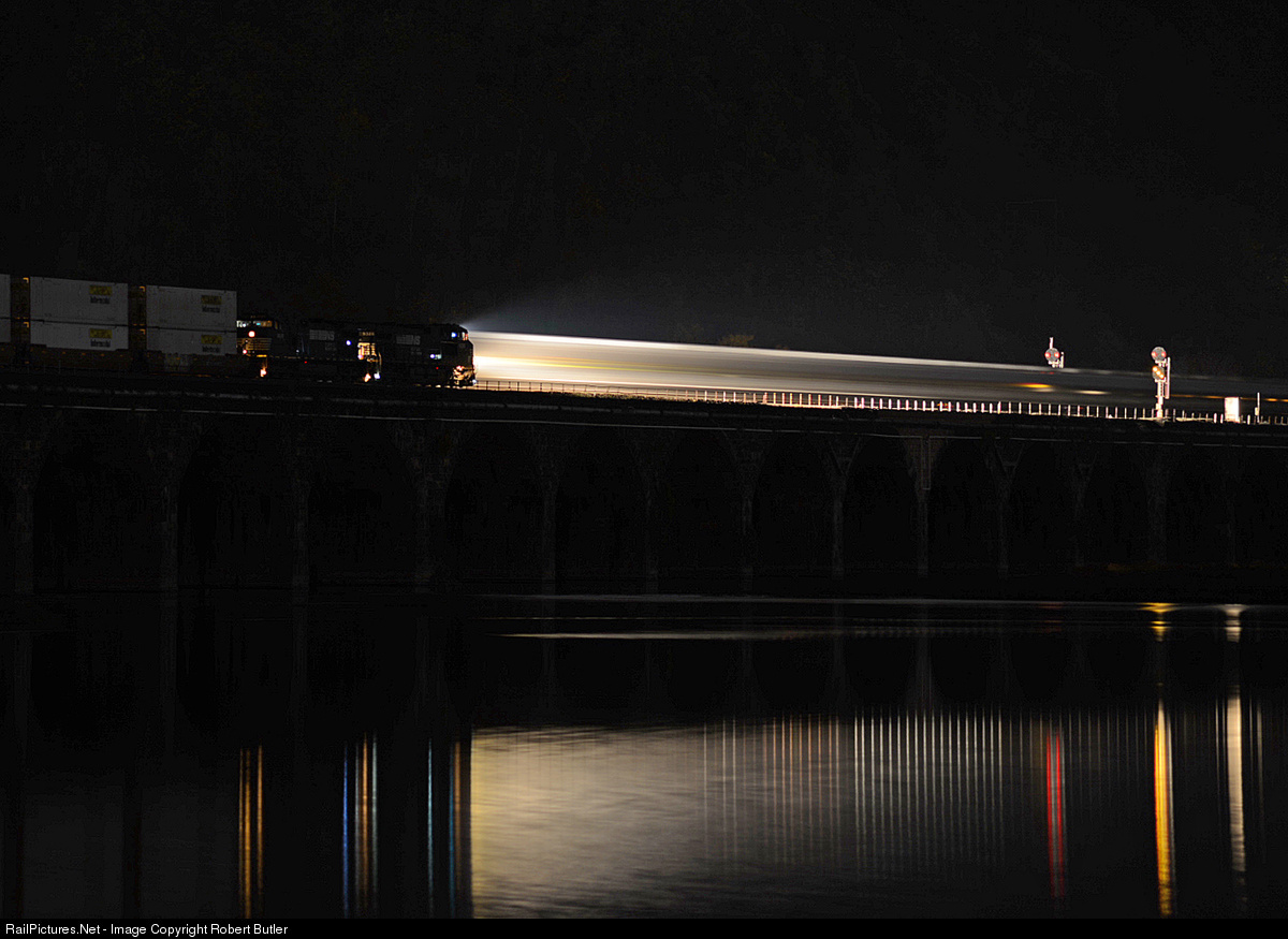 In the dead of night an eastbound stack train waits on the bridge for a westbound freight to clear the main into Harrisburg.