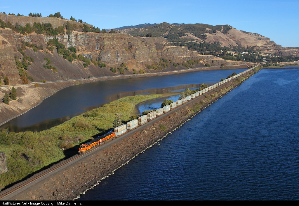 A westbound BNSF stack train departs Lyle, Washington, on a beautiful afternoon in the Columbia River Gorge on September 24, 2016. It looks like an intermodal train—but don’t let the containers fool you—it is an empty garbage train returning to western Washington after unloading at Roosevelt Regional Landfill.