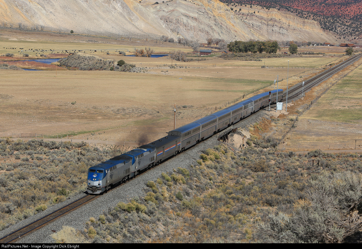 Amtrak #5, the California Zephyr, is just now leaving the siding at Range, Colorado after meeting its eastbound counterpart #6. Its next stop, about 28 rail miles west, is at the popular resort town of Glenwood Springs, Colorado. According to an Amtrak conductor I talked to it is not uncommon for #5 to disembark over 100 passengers at Glenwood Springs.