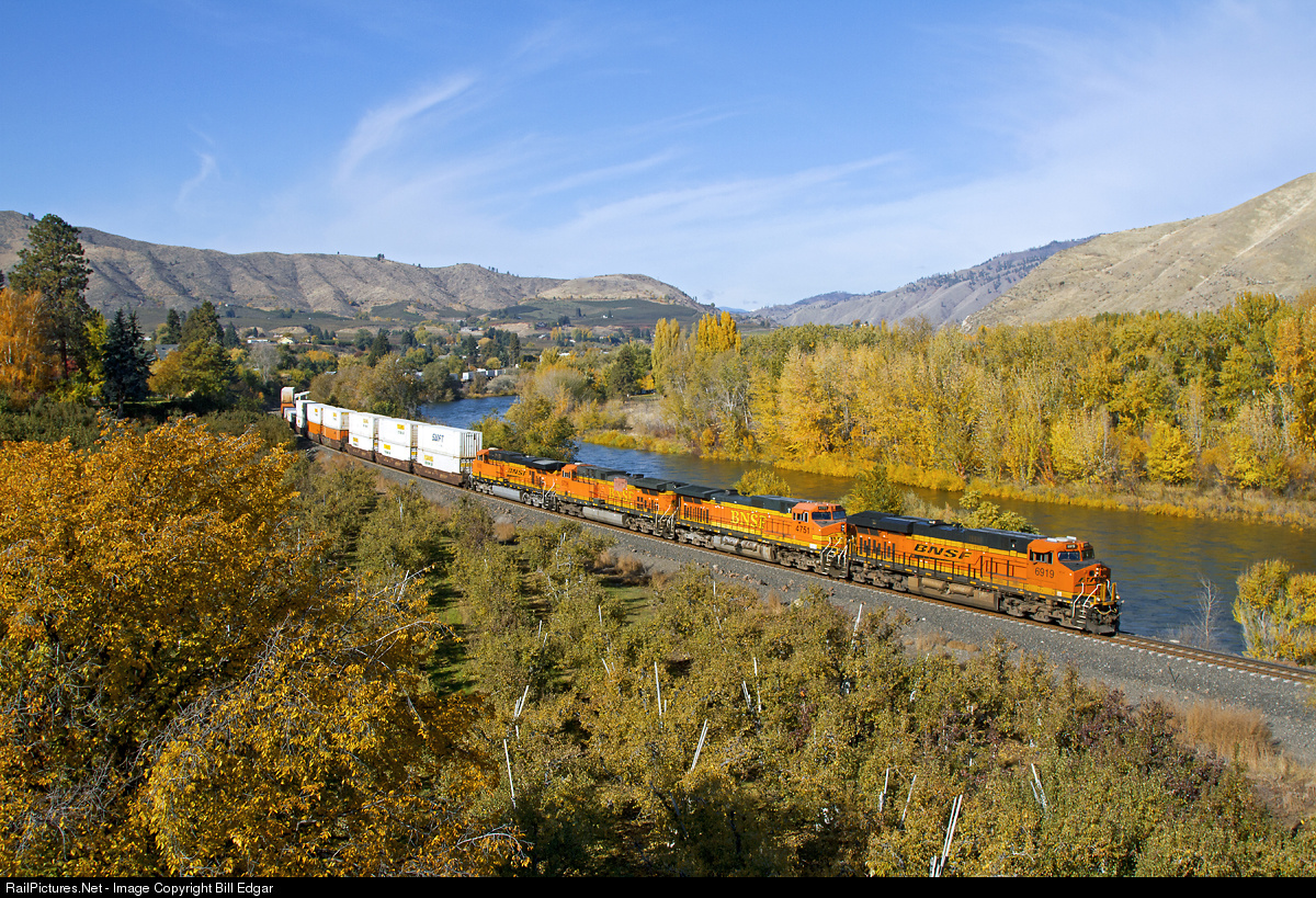 BNSF 6919 glides an eastbound Z train from Seattle around Monitor curve in maximum fall color for the area. Fall has lingered this year with a sun/rain mix and very little frost to date in north central Washington. The train is about 5 minutes west of Wenatchee and a crew change.