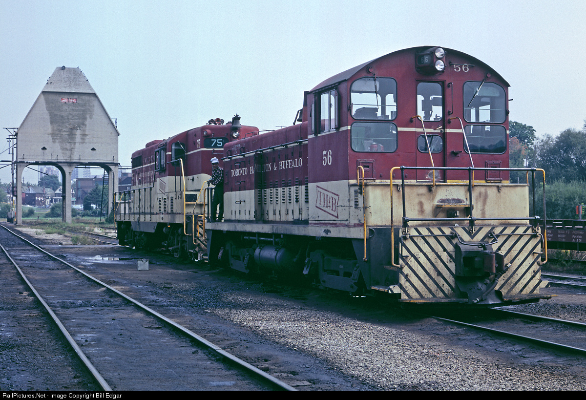 TH&B SW9 no. 56 and GP7 no. 75 idle at their Hamilton, ON engine facility. SW9 56 was built by General Motors Diesel Division, London, ON in December 1950 and sold to Atlas Steel, Welland, ON for scrap in May 1988. It was resold several times since, last reported in Belledune, New Brunswick in March 2006. The no. 75 was equipped with Automatic Train Control so it could run on the point on NYC trains east of Welland, ON. The unit was rebuilt by CP as CP1685, a GP7u in February 1988.