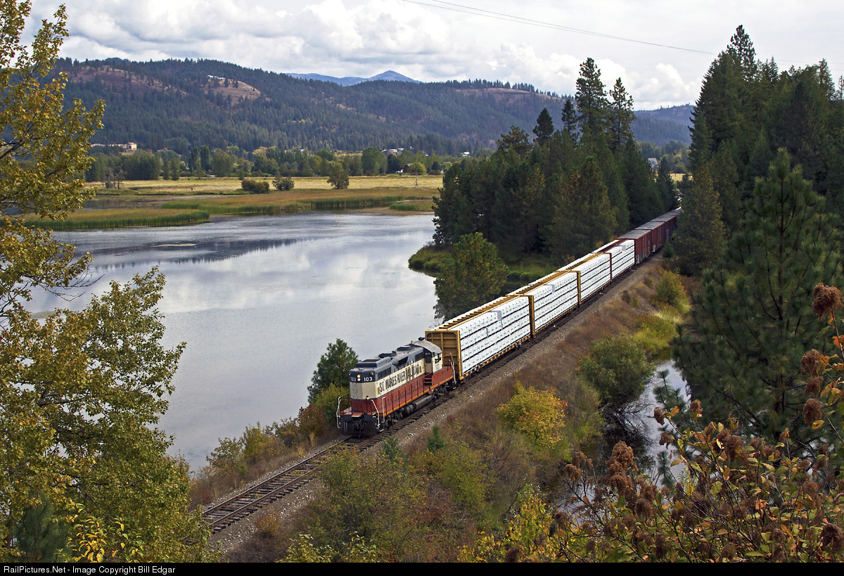 St. Maries River Railroad GP9 103, a former Milwaukee Road Geep, leaves St. Maries with a westbound train over the former Milwaukee mainline to Plummer, ID where it will interchange with the Union Pacific which will run a local from Spokane, WA.
