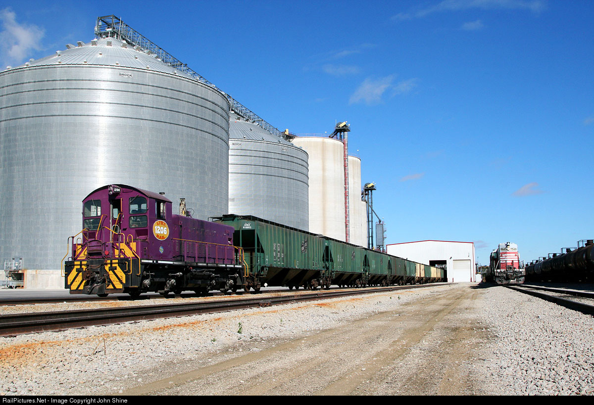 Larry's Truck & Electric 1206 (ex-Canadian Pacific 8103) unloads a solid cut of Chicago & North Western painted hoppers next to Bloomer GP-10 7549.
