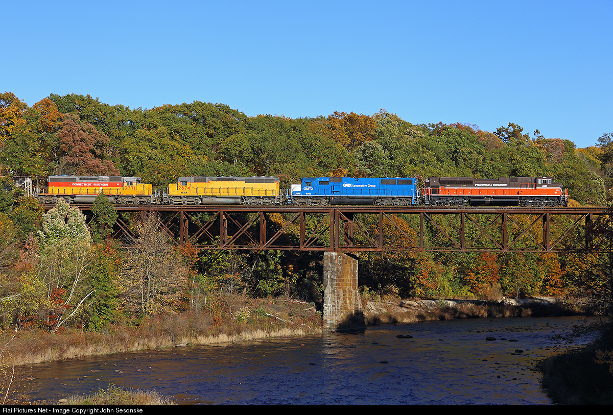 One of 2 former FEC SD70M-2's owned by the P&W leads a nice set of EMD power across Millers River on the former Central Vermont Railway (PW 4302 is former FEC 102). Trailing units are GMTX 9059 (SD60), NECR 2674 (SD40M-2), and CSOR 3771 (SD40-2). The train ran over Vermont Rail System from the CP interchange in Whitehall, NY to Bellows Falls, VT where it was handed off the the NECR for forwarding to the P&W to Providence.