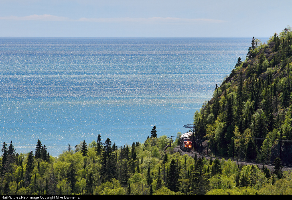 With the waters of Lake Superior glistening in the distance, Canadian Pacific train No. 112 rounds a corner approaching Middleton, Ontario, on June 11, 2016.