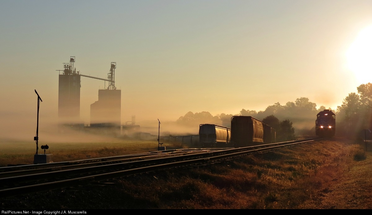 | With NS delivering a large cut of grain hoppers to Chester yesterday, the crew of the Lancaster & Chester are hard at work this Sunday. They have just finished taking their first cut of cars to the Circle S Feed Mill yard as the early morning sun peeks up over the trees and shows the dense fog in the area. The high hooded GEEP is in the process of running around their train to go back and get ready for the next load of the day. |