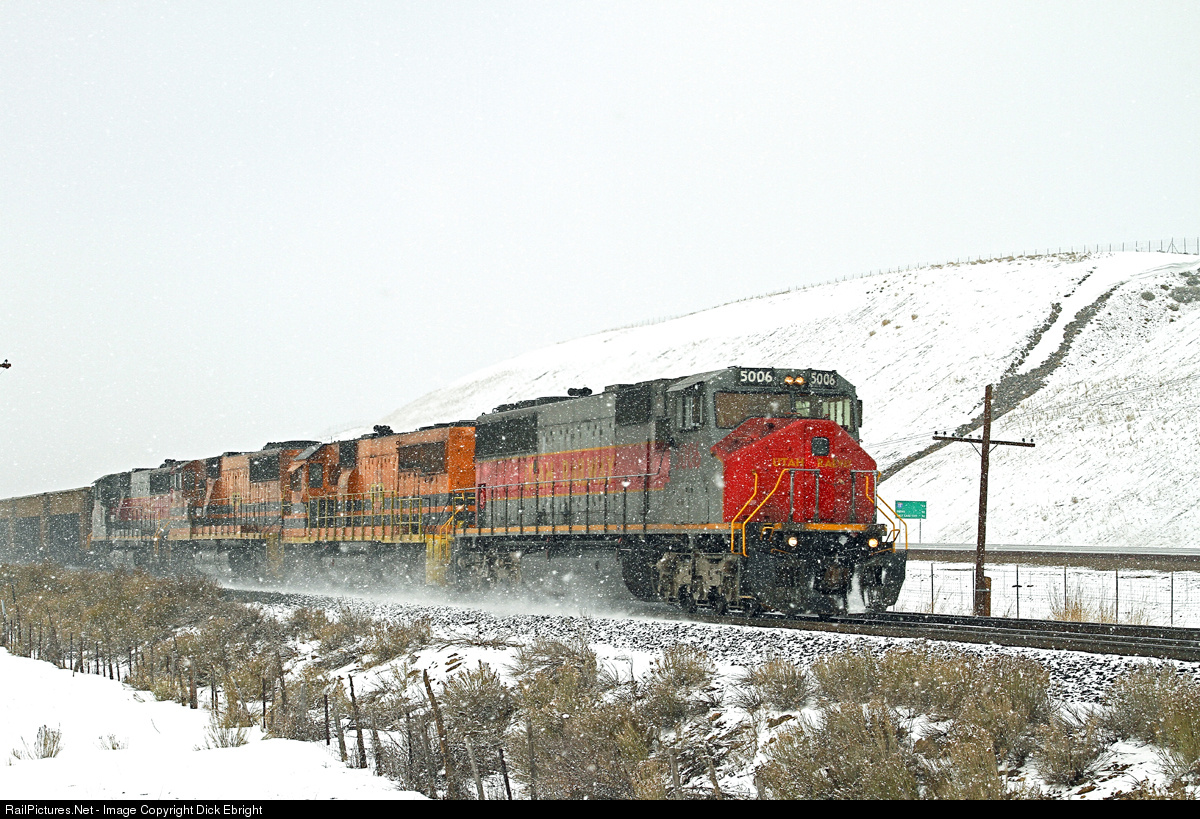 | Utah Ry’s #5006 is kicking up some fresh snow cruising down the east side of the Soldier Summit grade at Colton, Utah. It’s train of empty rapid discharge hoppers owned by the IPP Power Plant is headed for the Wildcat loadout on Utah Ry. trackage a few miles east of Martin Yard. A late Spring snowstorm is just ramping up at this time, but by tomorrow a foot of new snow will be on the ground here. This action is on the Union Pacific Provo Subdivision. |