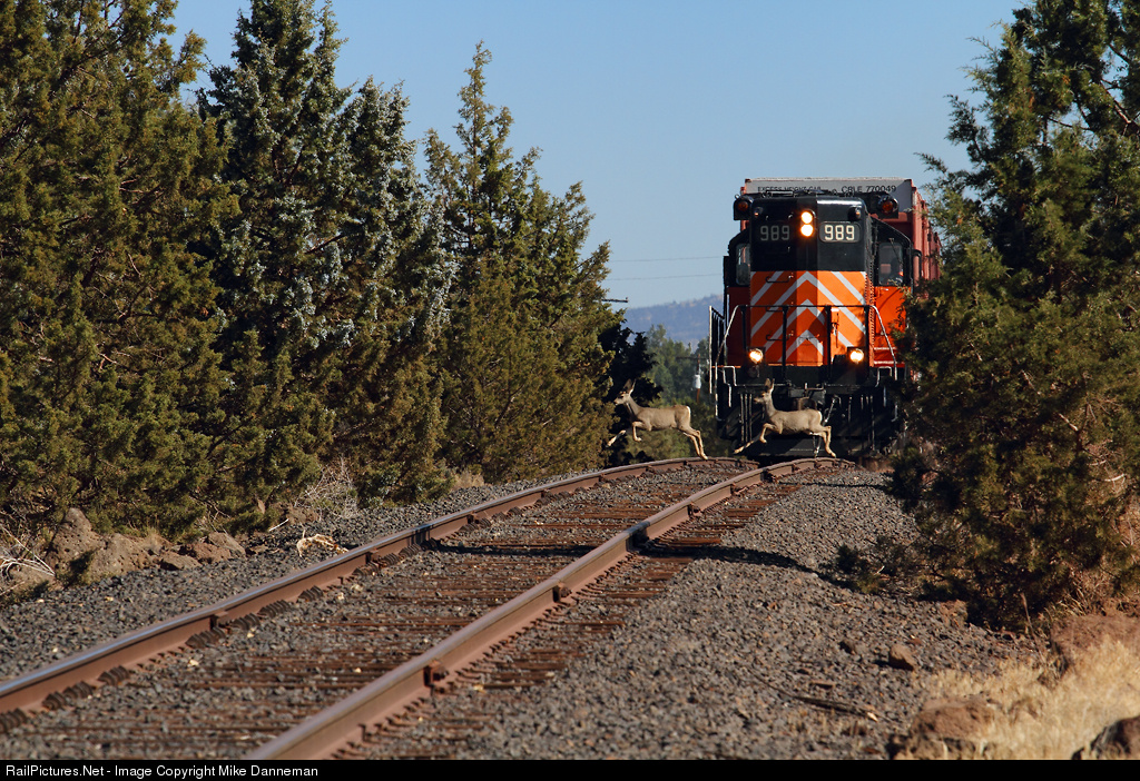 A pair of deer are nearly synchronized as they cross in front of a westbound City of Prineville Railway train approaching Prineville Junction, Oregon, on September 28, 2016.