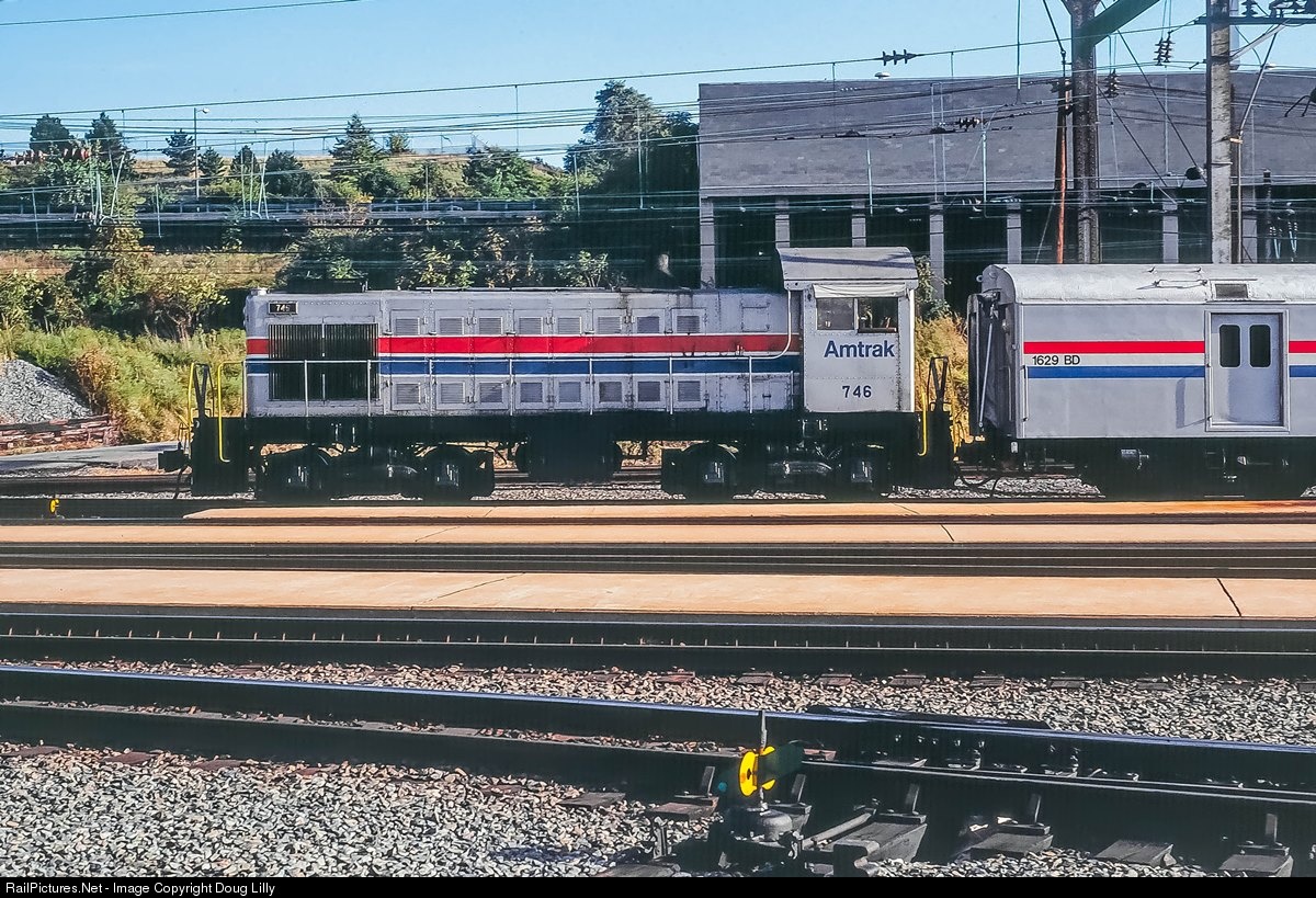 For reasons that I have been unable to determine, Amtrak found itself as the owner of a single Alco S2, originally U.S. Army 7110. The switcher, initially retaining its Army number, was assigned to duties at Washington Union Station, where it shared a lot of maintenance characteristics with the fleet of Washington Terminal RS1’s that were based there. Originally painted in the pointless arrow (Phase 1) scheme, the Alco later was renumbered 746, receiving a Phase 2 paint job. Here the roster anomaly shunts head-end cars around the station.