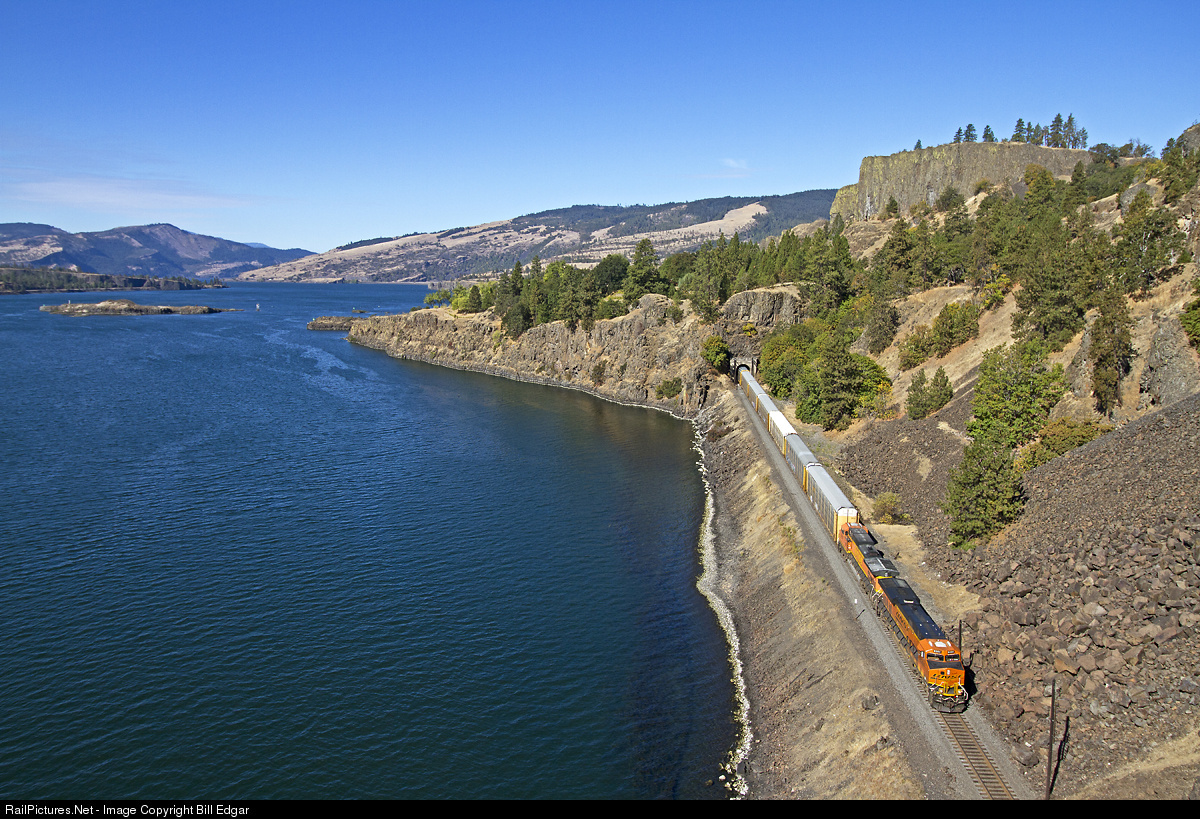 | A BNSF eastbound vehicle train threads through the four tunnels west of Lyle, WA along the Columbia River near Chamberlain Lake. The train is exiting Tunnel 7 and headed into Tunnel 8. Tunnels 9 and 10 are immediately following with a fifth tunnel, Tunnel 11 on the east end of Lyle. |