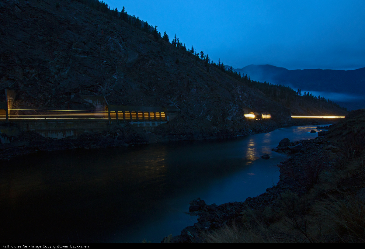 Canadian National's premier intermodal train streaks through the Thompson River canyon at 1815 on a dreary November day.