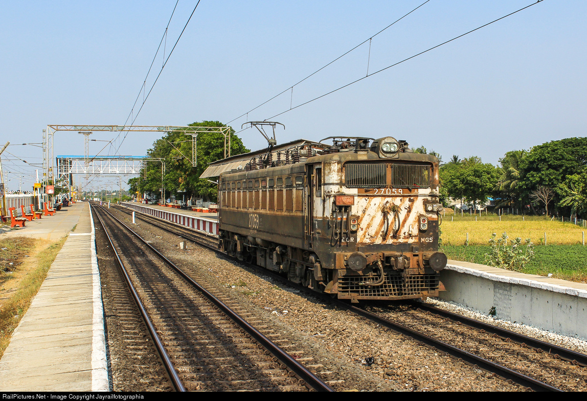 Freight locomotive, WAG-7 of Mughalsarai shed sporting a rugged look moving light towards Arakkonam side on a peak summer afternoon