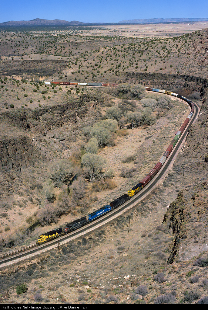 Rolling through Crozier Canyon east of Valentine, Arizona, is a westbound freight on March 6, 1996. An interesting set of EMD locomotives is powering the train led by Santa Fe GP50 No. 3812. Trailing is Southern Pacific SD40R No. 7361, Conrail SD60M No. 5545, a grubby SP SD45T-2 and a Santa Fe SD45-2.