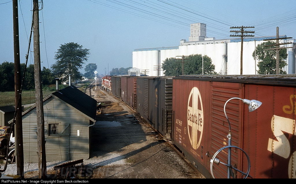 Fallen Flags everywhere. While waiting inside Gibson City Tower for the American Freedom Train passenger special to arrive, Tom Golden was able to capture a freight pass through on the Illinois Central Gulf mainline. Led by a pair of red and white GM&O EMDs, boxcars from several fallen flags can be seen behind the locomotive consist. Tom Golden photo.