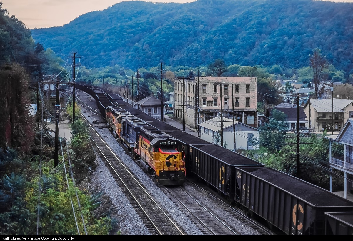 Hinton, West Virginia was a busy division point on the Chesapeake & Ohio. Although there was other traffic, the predominant commodity carried on the C&O was West Virginia coal. Here a loaded eastbound train with two SD50’s leading is well on its way out of town as a westbound train of empties rolls into Hinton with four GP’s.