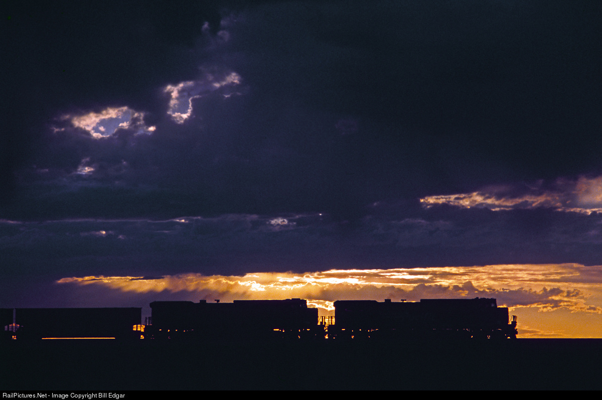| Perhaps the best time to visit the Powder River Basin is dawn or dusk. Summer weather with its frequent thunder storms can create some fabulous skies. All you need is a train, and at its peak, that was not all that difficult to achieve with over 100 trains a day on this coal line. This is a northbound UP coal empty heading north towards Bill just before sunset. |