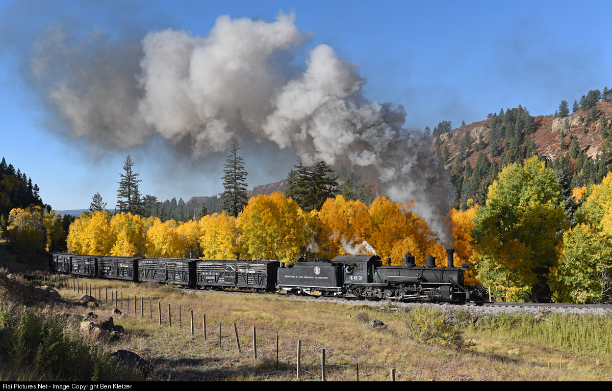 Denver & Rio Grande Western #463 struggles up the steep grades out of the Narrows with a stock train bound for Cumbres Pass and eventually points east. This is just a small section of a larger train that #463 would bring uphill in sections and then would be taken east by K36 #489 the next day.
