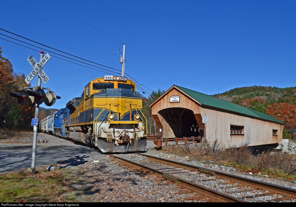 | Vermont Rail System Rutland To Bellows Falls train 263 passes in front of the covered bridge at Bartonsville VT. The original 1871 bridge was destroyed by Hurricane Irene in 2011 and a new bridge was built and opened in 2013. |