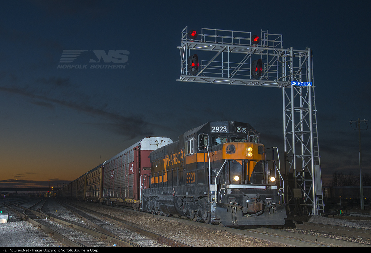 In October of 1959, Southern Railway SD24 number 2508 was completed by EMD. Fifty seven years later, it survives, rebuilt by the Illinois Central as an SD20 and now working as Indiana Harbor Belt 2923, still helping to move freight for Norfolk Southern. Shortly after sunset at IHB's Gibson Yard in Hammond, Indiana, 2923 is seen switching a long cut of autoracks, classifying cars for destinations across the country. Norfolk Southern routes much of its automotive traffic to Gibson, where the regional railroad then sorts and forwards the loads to their next destination. Photo by Casey Thomason. For more information about Norfolk Southern, visit www.nscorp.com