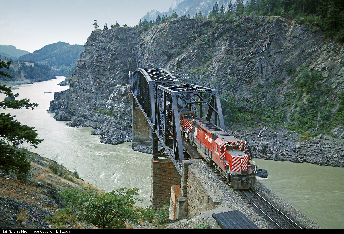 CP 5820 pops its train out of a tunnel and over the bridge at Cisco, BC. It will tuck under the famous CN bridge at this location and continue east through Lytton and on to Kamloops. The two railroads chose this location to cross the Fraser River, thus switching sides. CP was here first and presumably got the better choice.