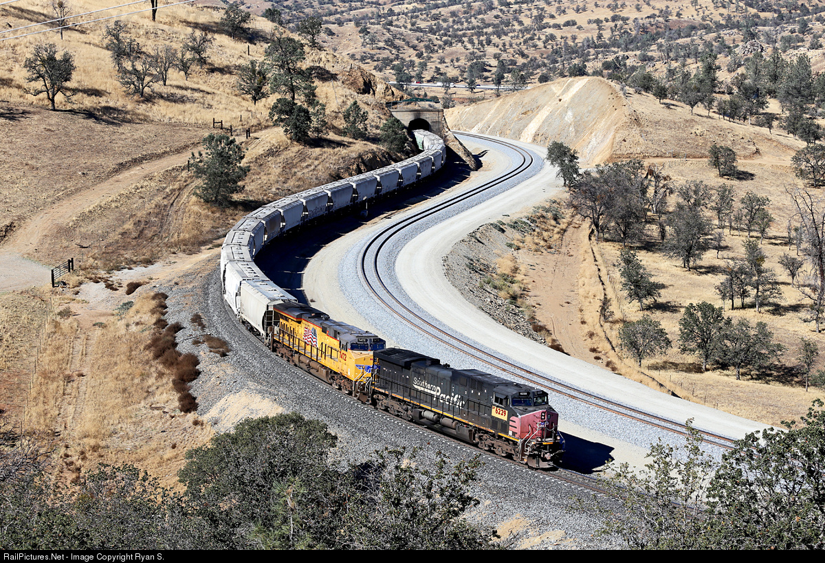 The old guard at Walonger…… On September 11th, 1996 the vast empire of the Southern Pacific Railroad was folded into the camp of their age old ally and rival, the Union Pacific. Since that time Southern Pacific's crossing of the Tehachapi Grade has witnessed many changes over the last two decades. None of the changes over the years have been quite as physically drastic as 'Walonger', the project in which the 4800' siding at Walong was linked up with the 6189' siding at Marcel, creating a new stretch of double track railroad. Work began on the project in 2015 and one year later the new main track was placed in service. With the pristine new main track two right of way basking in the afternoon sun a eastbound empty cement train emerges from tunnel 10 while climbing the grade behind former SP AC4400 #181, now UP 6229. It has been over 20-years since the once familiar scarlet & grey was the ruler of these rails but even now the old guard can still be found visiting the locations that were once so common to it, after all this will forever be remembered as Southern Pacific's Tehachapi.