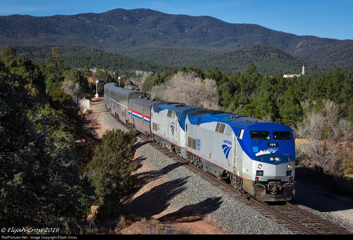 | Having reached the summit of Glorieta Pass, seen here Amtrak's Southwest Chief accelerates out of Glorieta, continuing it's eastward journey as it traverses the breathtaking high-desert terrain of Northern New Mexico. |