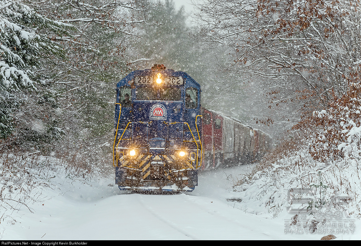 Green Mountain Railroad train #263-21 with VTR GP38-2 202 (in Washington County paint), GMTX GP38-3 2684, VTR GP38-3 206, VTR GP40-2W 310 and VTR GP40-2W 311, heads up grade at Cuttingsville, Vermont. More than a foot of snow fell in the green mountains and intense snowfall lasted for the entire trip up and over the Green Mountains summit for the 263.