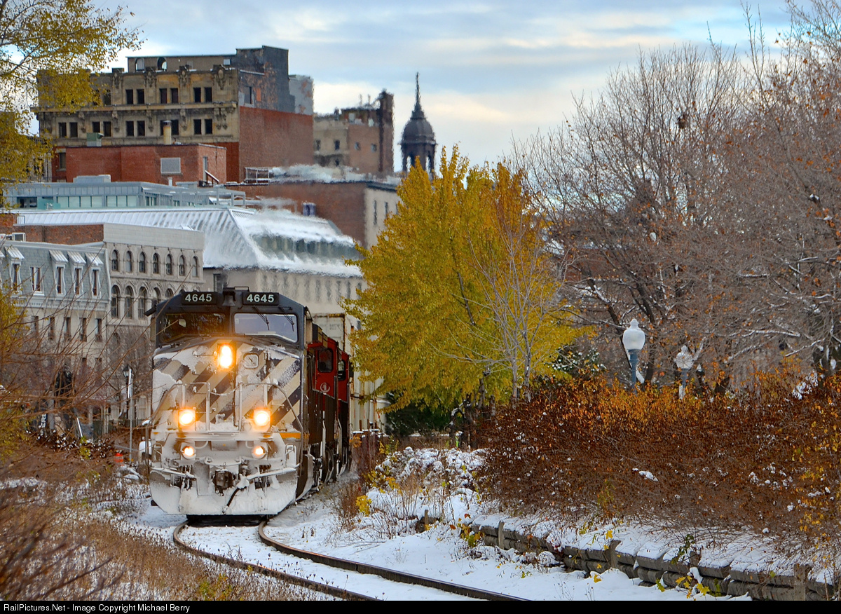 A bit of snow, a bit of fall colors. The day after Montreal got a bit of snow, BCOL 4645 leads CN 149 out of the Port of Montreal, with a small amount of fall colors still visible.