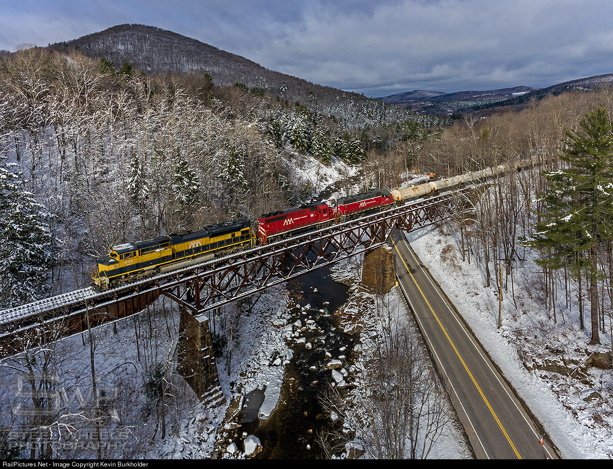 To quote a Big and Rich album name, "Horses of a Different Color..." Taking that a step further, each type of road locomotive on Vermont Rail System's roster is featured on the head end of 263-23 as it crosses the Mill River at Cuttingsville. Leading the hefty train is VTR SD70M-2 432, GP40-2 303 and GP38-3 206. The nearly foot or more of heavy wet snow from Monday is settling as another weekend storm is expected. Thanks to Mother Nature for employing the sun filter JUST for this photo!