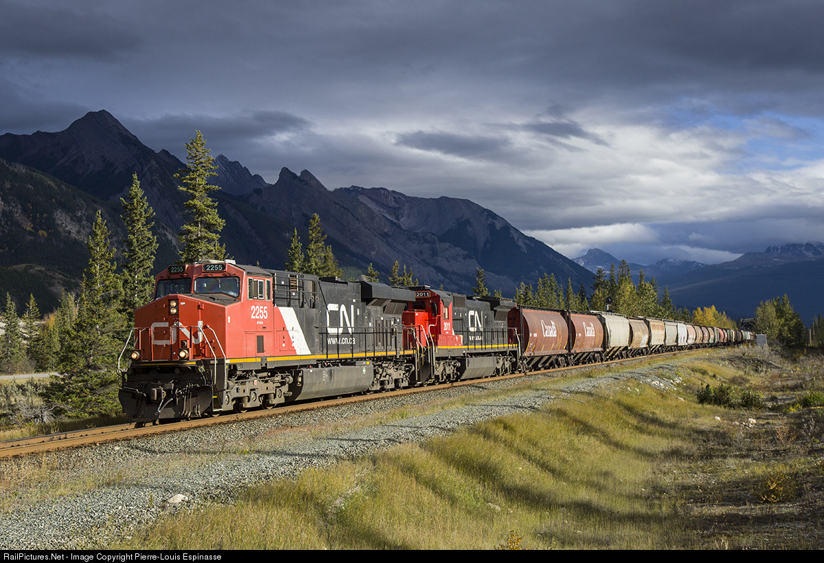 | Outpacing thunderstorms moving in from the southwest, CN eastbound grain train passes at Henry House, Alberta.