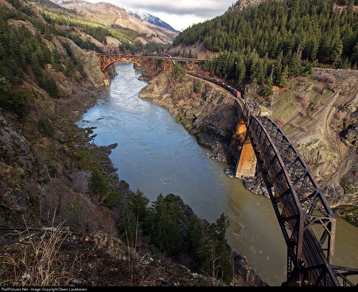 A Canadian Pacific GEVO works coal empties through the Fraser Canyon at the iconic Cisco Bridges. The train is eastbound on CP's Thompson Sub, and is passing underneath CN's Ashcroft Sub as the two mainlines swap sides of the canyon.