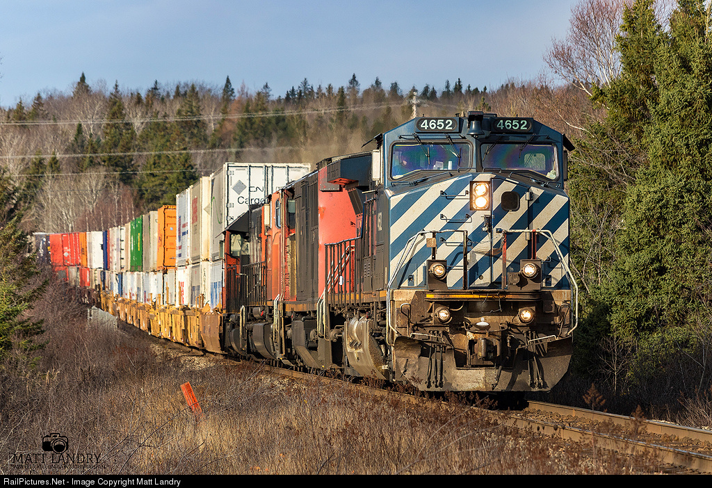 BCOL 4652 leads eastbound stack train Q120 as they approach Oxford Jct, Nova Scotia. Due to engine problems, the original leader of this train, CN 8940, was set off west of Edmundston, New Brunswick. They took this unit to use from westbound train M305. Luckily for me.