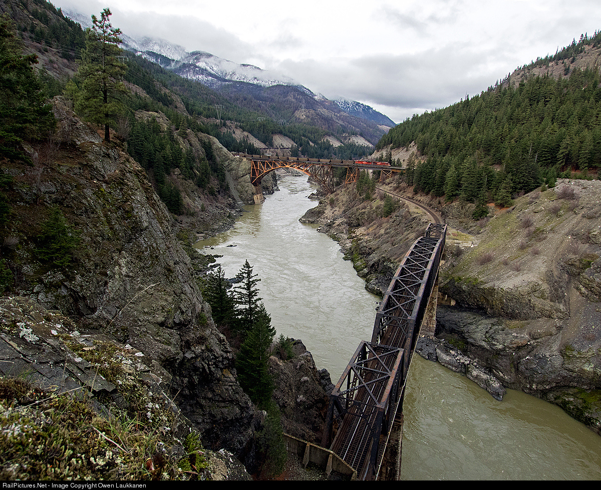 | A Canadian Pacific coal train crosses the Fraser River at Cisco. This westbound is traversing CN's Ashcroft Sub; the locomotives are passing over CP's Thompson Sub, which handles eastbound traffic from both railroads. |