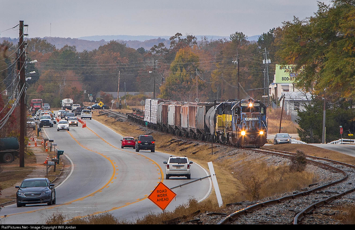 The hills of north Georgia overlook a ribbon of jointed steel rail that negotiates the landscape formerly dominated by the Southern Railway. A Hartwell Railroad southbound glides out of Toccoa behind the power of a GP38 built for the Penn Central in 1971, later owned by Conrail (who's livery it wears now), then by CSX, whom Hartwell got it from, and a GP40 straight out of the mountains of Maine and New Hampshire, formerly owned by the St. Lawrence and Atlantic Railroad.