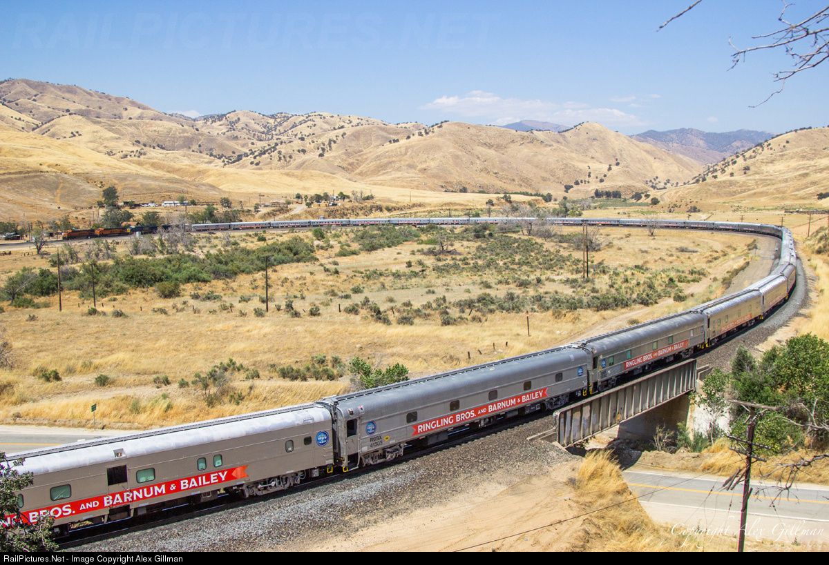 Curving to the north once more after traveling south upon exciting Tunnel 2, the Ringling Brothers Barnum & Bailey Blue Unit circus train eases downgrade and into the town of Caliente on a hot summer afternoon.