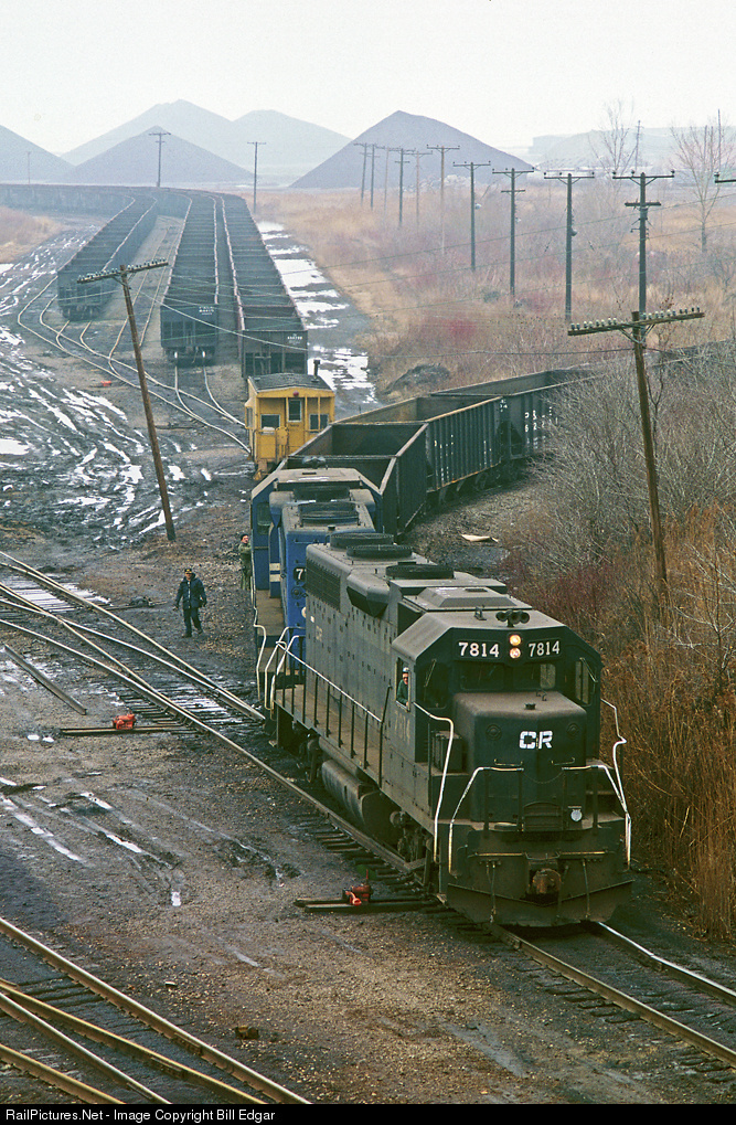 | A dismal day for a dismal looking engine. CR 7814 and a repainted mate are switching Pittsburgh & Lake Erie hoppers at the Lake Erie waterfront in Ashtabula on a dreary March day. This facility handled both iron ore and coal, and I am unsure which these care were being switched for. A PLE caboose in behind the units, and I understand PLE gained access to Ashtabula after the Conrail merger in 1976. PLE had been affiliated with New York Central interchanging at Youngstown traditionally. |