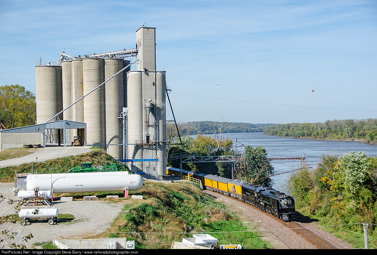Union Pacific 844 runs along the Missouri River as it passes the mill at Wavery, Mo. The train is on the Kansas City-Jefferson City leg of a trip that took the locomotive from Cheyenne, Wyo., to Memphis, Tenn.