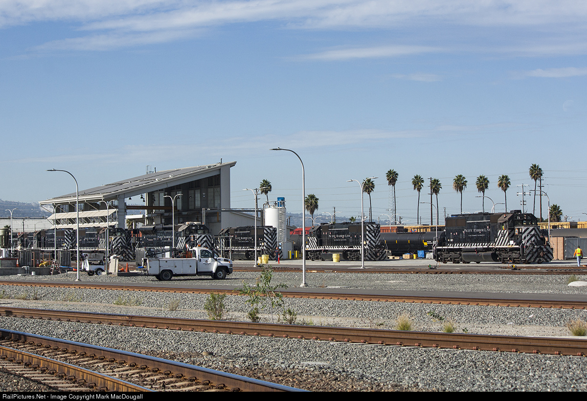 | Various PHL low emissions units including four and six axle MP20s and their lone PR43C wait between assignments at Berth 200. On the right, the 0800 Switcher brings in a unit off the YPHN15 Hanjin Switcher that is getting swapped out. |