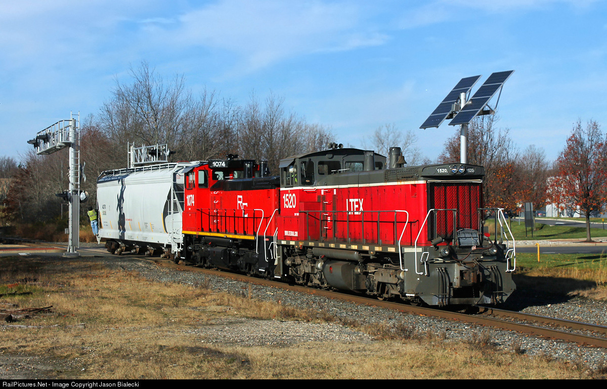 A pair of EMD SW1500s are shoving a single hopper across Raritan Center Parkway. RC 1074 appears to have been adopted into the fleet as former LTEX 1074