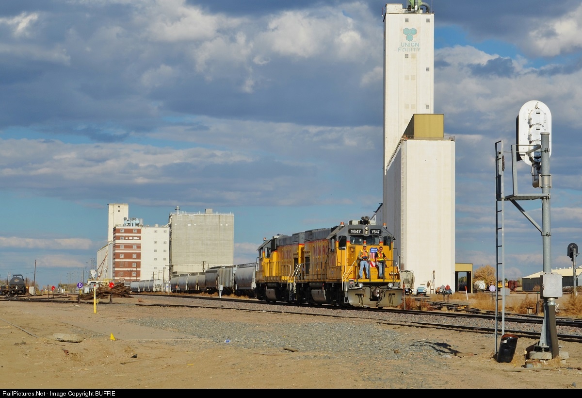 UPY 647 (GP15-1) has just dropped of an empty oil can and passes the Commerce City Grain elevator on its way back to home base.