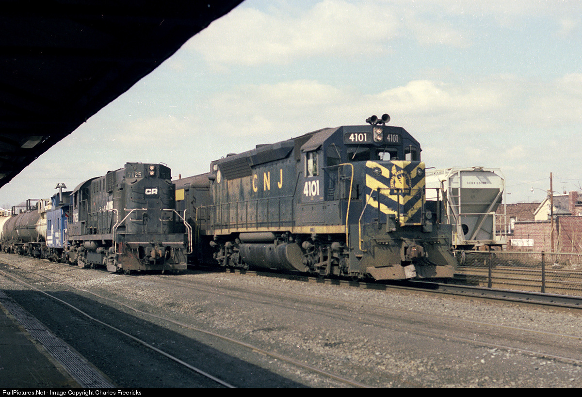 On March 28, 1978, 16-year-old me took the train from Oradell to Hoboken, the PATH to Exchange Place, the PATH to Newark, and the old CNJ from Newark to Bound Brook one Spring Break morning. Unfortunatley I was not very good at focusing the camera and most of those photos are soft to blurry. This one I was able to save on Photoshop with some spot sharpening. A patched ex Penn Central RS11 works some local freight cars while a renumbered ex Jersey Central GP40P pulls some standard commuter coaches into the station.