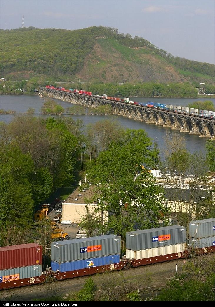 From foreground to upper left, this eastbound intermodal led by NS 9766 covers the entire 3830 foot length of the Rockville Bridge.