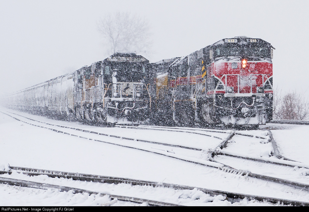 A visiting NS grain train shares the yard tracks with 513 as the first snow of the season falls.