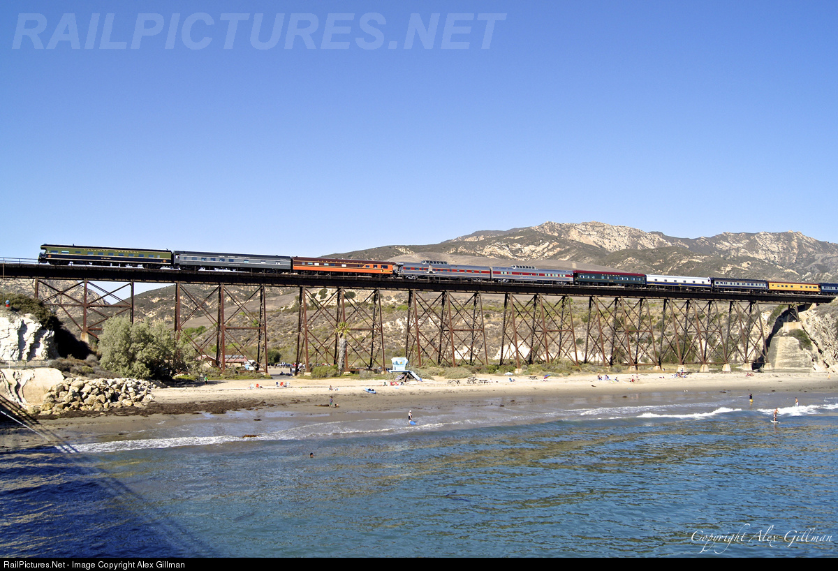 In a stunning display of colors not likely to grace the 811-foot long trestle at Gaviota again anytime soon, the 2013 AAPRCO "Napa Valley Limited," made up of 21 privately owned passenger cars, races south toward its final destination of Los Angeles.