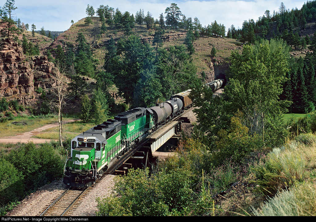 Burlington Northern’s Helena Turn heads through Wolf Creek Canyon west of Wolf Creek, Montana, on August 25, 1993. Powered by GP39M No. 2885 and SD40 No. 6304, the train is exiting Tunnel 4 and crossing Bridge 181.7 over Little Prickly Pear Creek and Lyons Road in the scenic canyon. Unfortunately, this line is no longer in service.